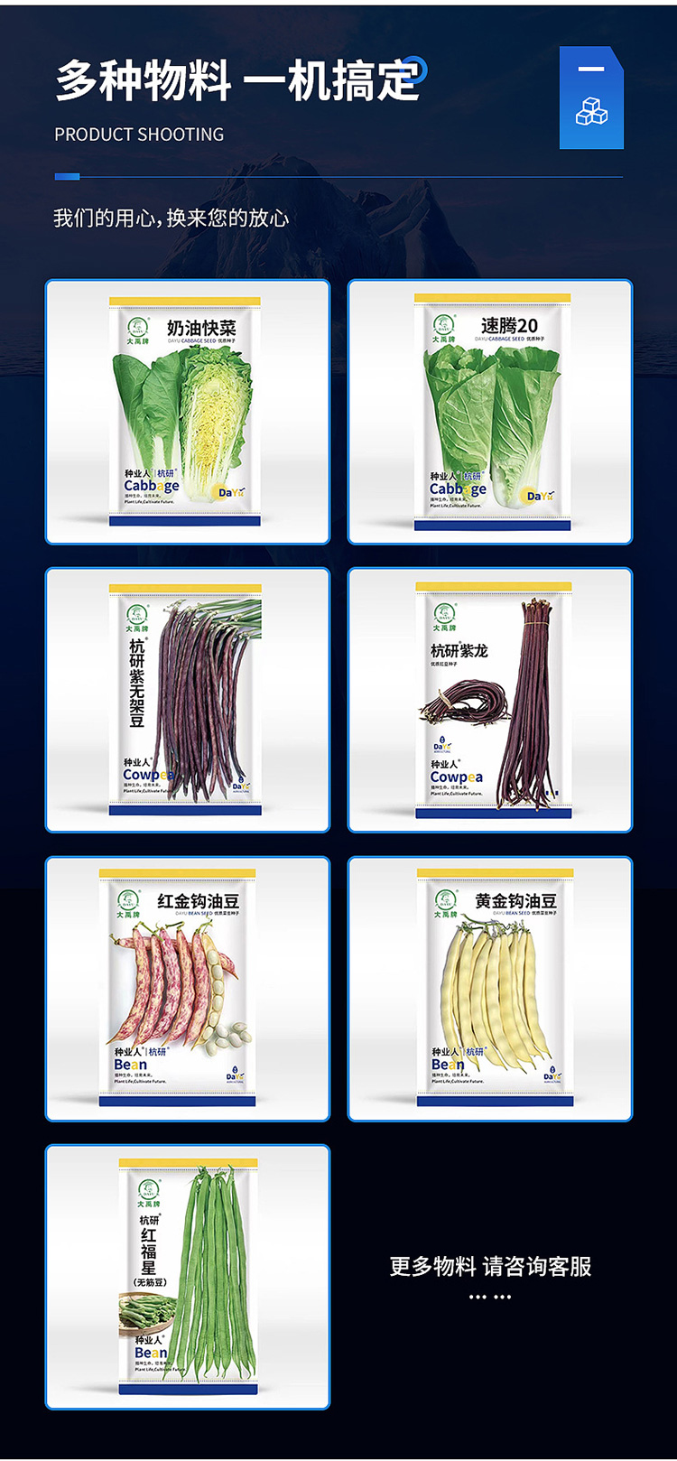 此機可應用于種子包裝系列、五金零件系列、食品、藥品系列、農產品系列等產品的裝袋包裝,此機為外袋款包裝機,可將產品散裝進預制包裝袋,生產速度快,節(jié)省人工。此機采用電腦智能化控制系統(tǒng),配置高、速度快,每分鐘速度可達0-28包,稱重采用線性四頭秤和量杯秤可選。袋褲采用絲杠旋鈕式寬度調節(jié)便捷,開袋采用雙頭吸氣,燙袋自動排氣,機體加厚穩(wěn)定性更高,采用墨輪印刷耗材少,性能穩(wěn)定,具有智能操控,無袋自動停機,未開袋自動檢測不下料、不封口、不打碼,減少浪費,氣壓檢測報警等一系列自動化、智能化輔助功能讓操作更省心,此機已獲得國家專利ZL 2021 2 3144429.2。